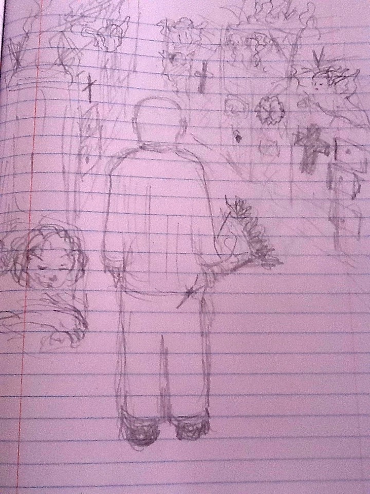 I just couldn’t take his photograph; for one thing, I was in tears, so instead, in my notebook, did the not- very-good drawings of him below; the bromeliad angel, above.