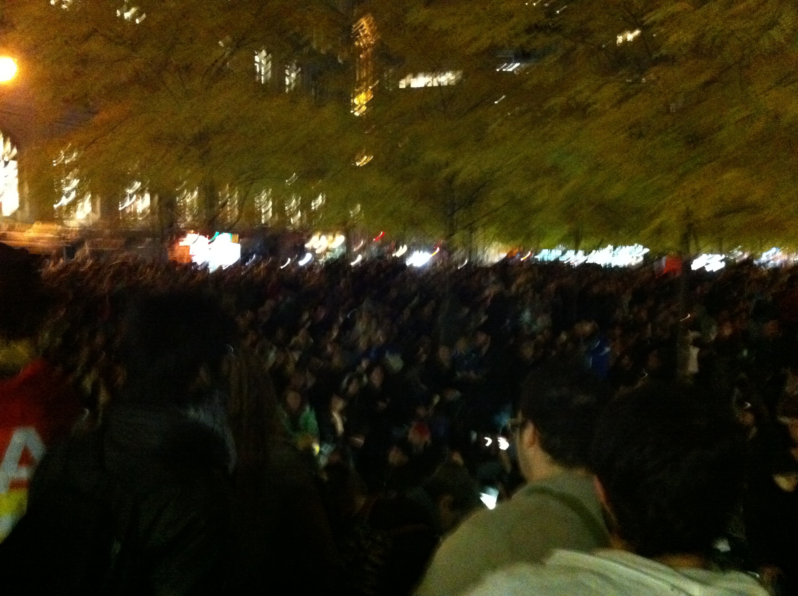 Yesterday (Friday, November 18), was a much calmer day–a whole lot of chatting going on: Protesters or bystanders with the police (some of the younger protestors were kind of taunting, but most people seemed just to talk)==the police gabbing with each other–the Brooksfield people (I think they are the security guards in neon green vests) moaning with each other–the protestors chanting, and in the evening, singing soft songs.