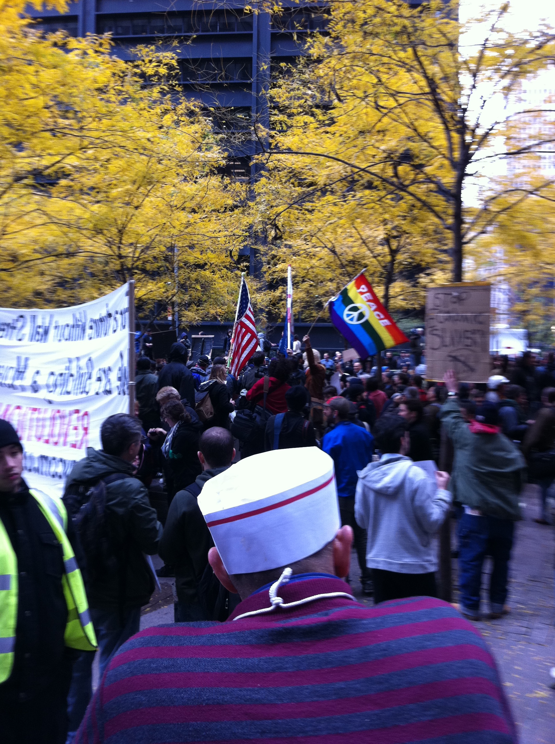 The Daily Show had a piece by Samantha Bee talking about the divisions in the park before the break-up. I had not specifically focused on these before, but I think Bee’s piece was really accurate–the library, the speak and repeat crowd, the bicycle generators (all put together by the more “intellectual” types) were on the East Side by Broadway–the drum circle, the Sufi-garbed and yogic breathing, cat guy, tended to be at the West End (by Church.)