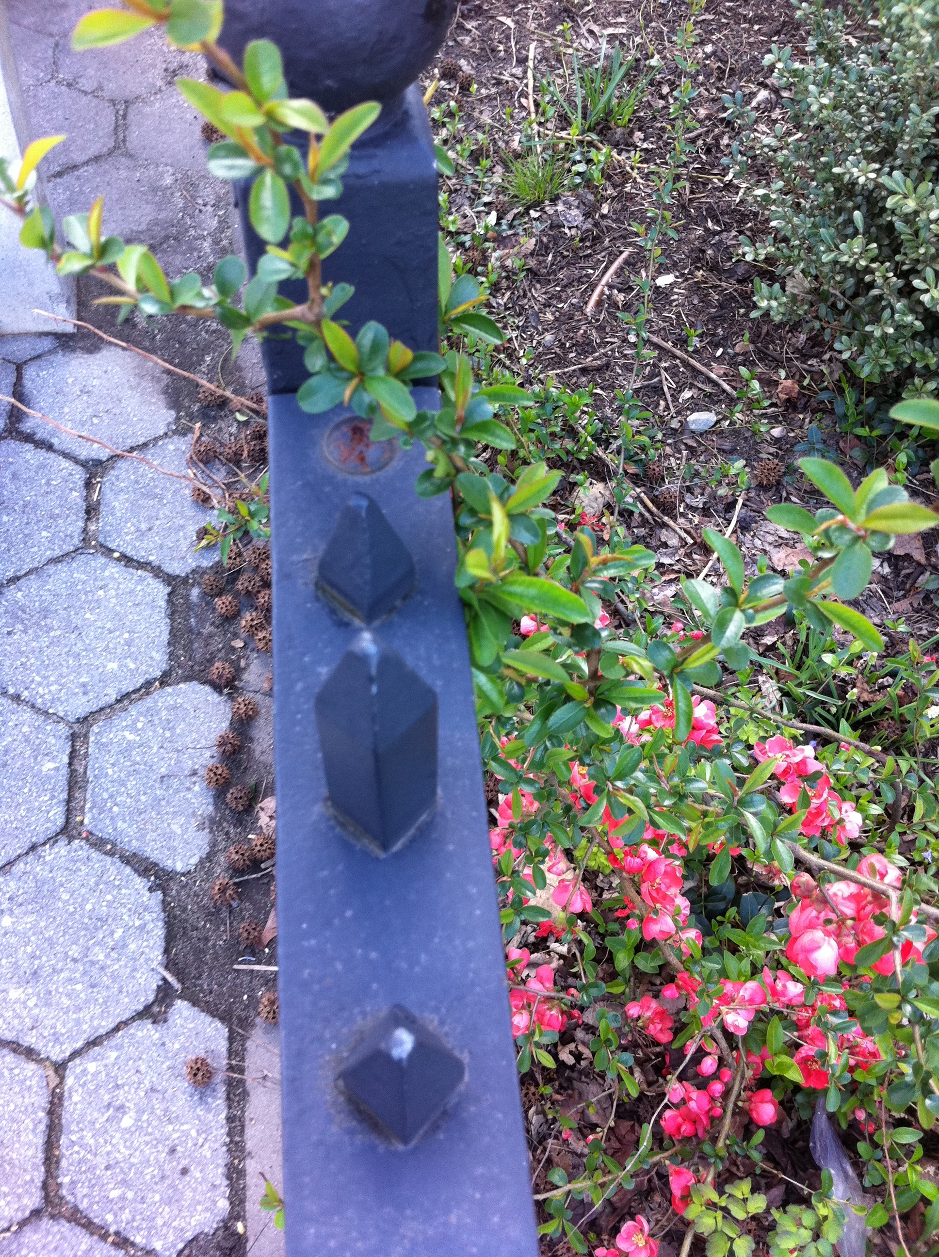 I pause this morning in the middle of walking Pearl to take a photo of what seem to me to be the first roses of spring. This being New York City, they are behind iron bars.
