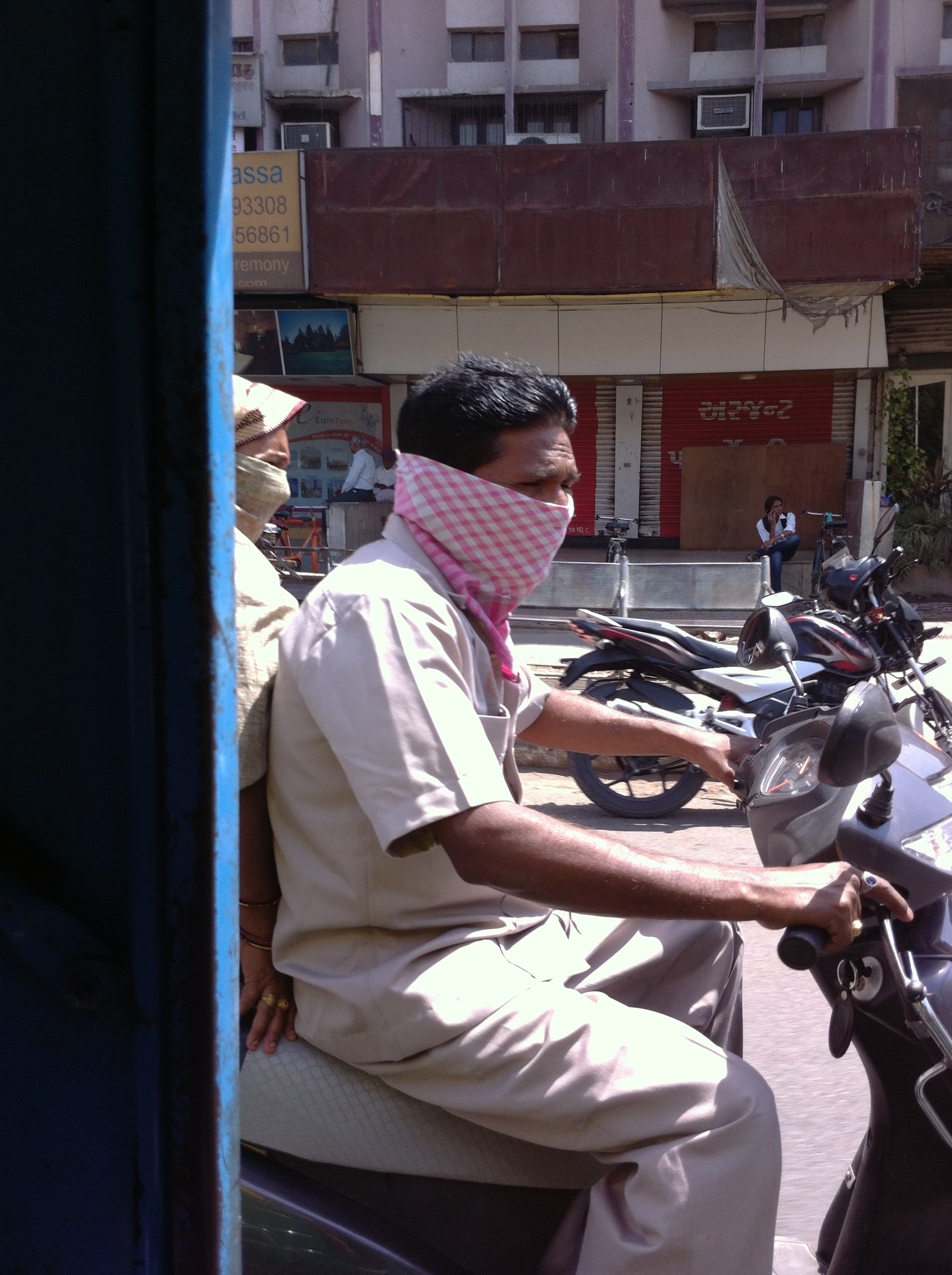 It feels barely liveable in the heat of the day with traffic honking from every direction. But people obviously get inured to it. It feels like it would even be quite difficult for those in the midst of the traffic, but those on motorbikes look inperturbable, plowing headlong–well not headlong – they are dodging around each other nonstop–ahead. Men frequently wear headscarves to cover their mouths, while women wear scarfs to cover virtually all their skin – mouth nose eyes forehead hair. Many women even wear long beige-pink gloves over their arms, and toe socks with their sandals. Auto rickshaw drivers seem to frequently drive barefoot, their chappels – sandals–to one side of the gas pedal or clutch.
