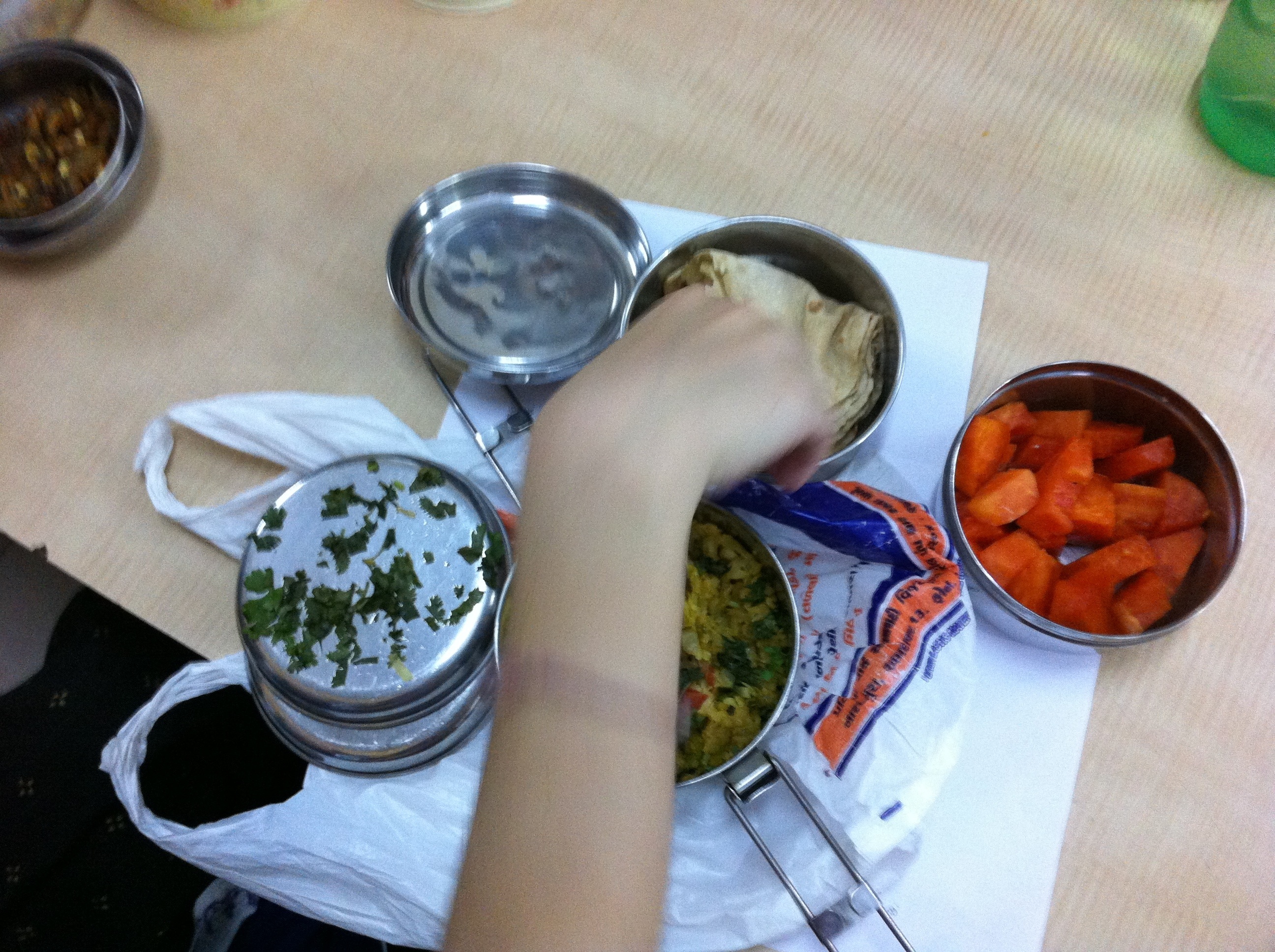 (Above is my daughter eating from a tiffin prepared for her on a regular basis for lunch. I do not suspect the tiffin.)