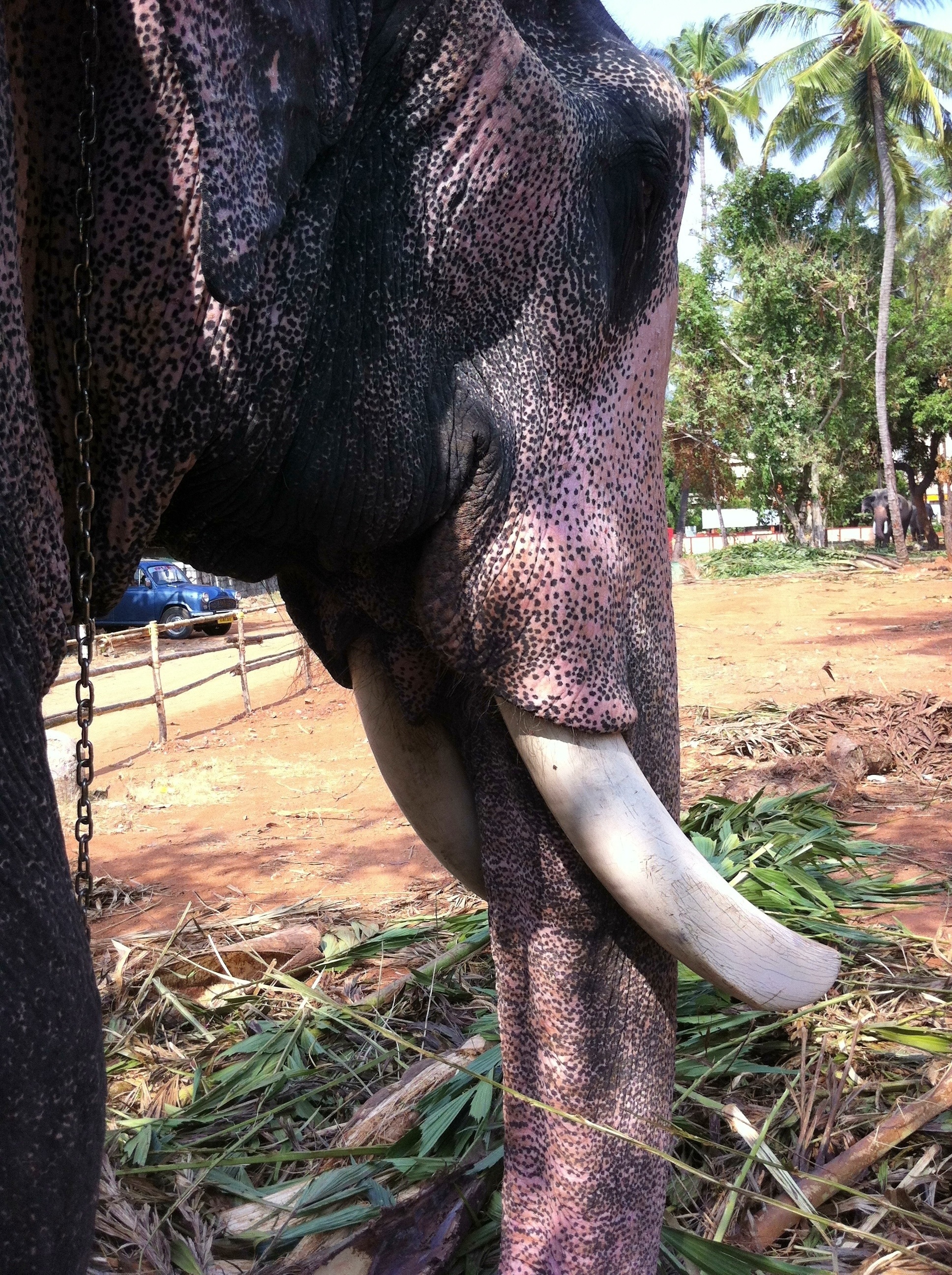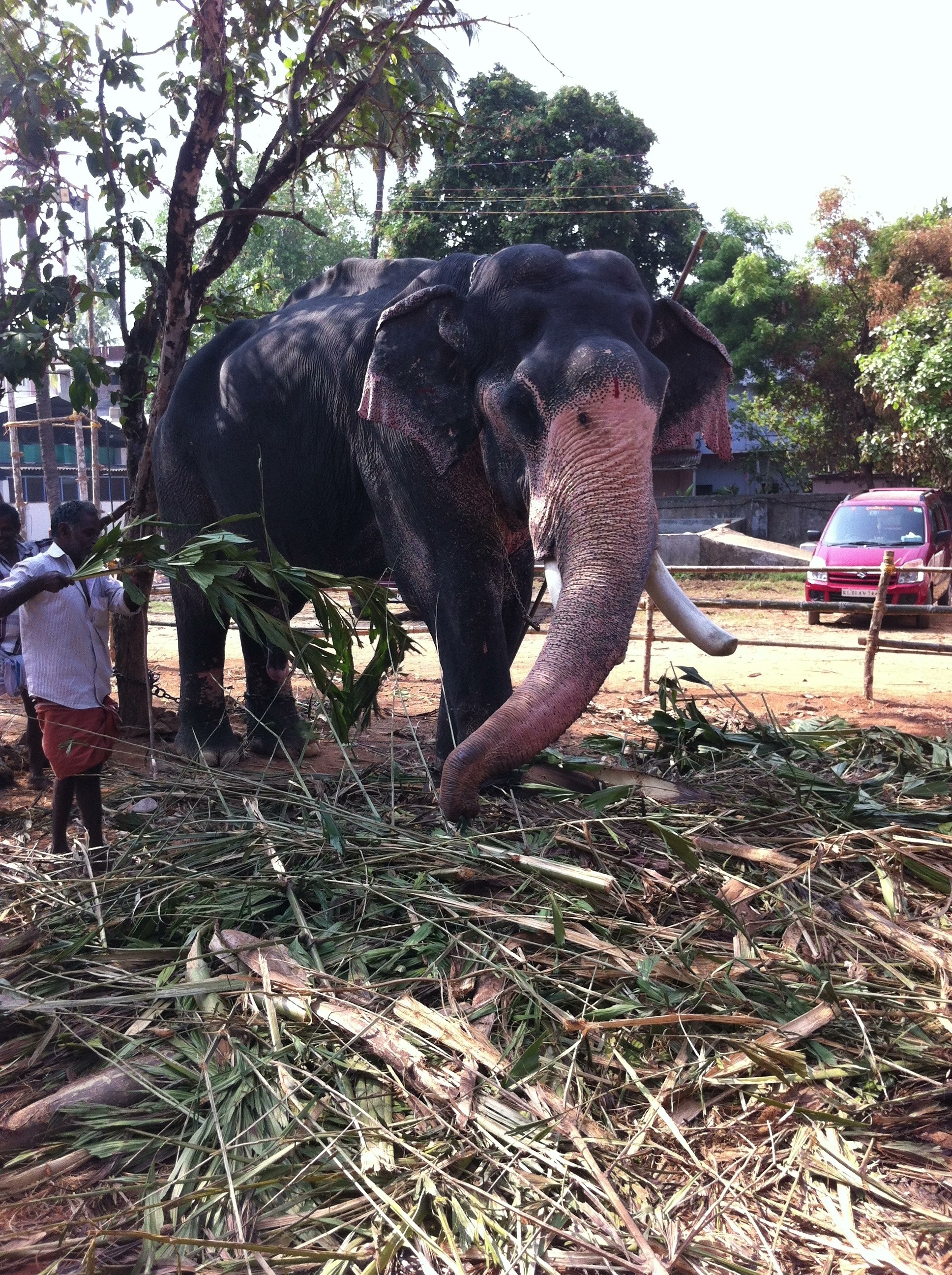 (PS– these are pictures from Thrissur, India, a couple of days before a large elephant festival, where elephants, in costume, parade around a Hindu temple. The guy in the photo is the elephant owner or trainer. The young woman is my daughter.)