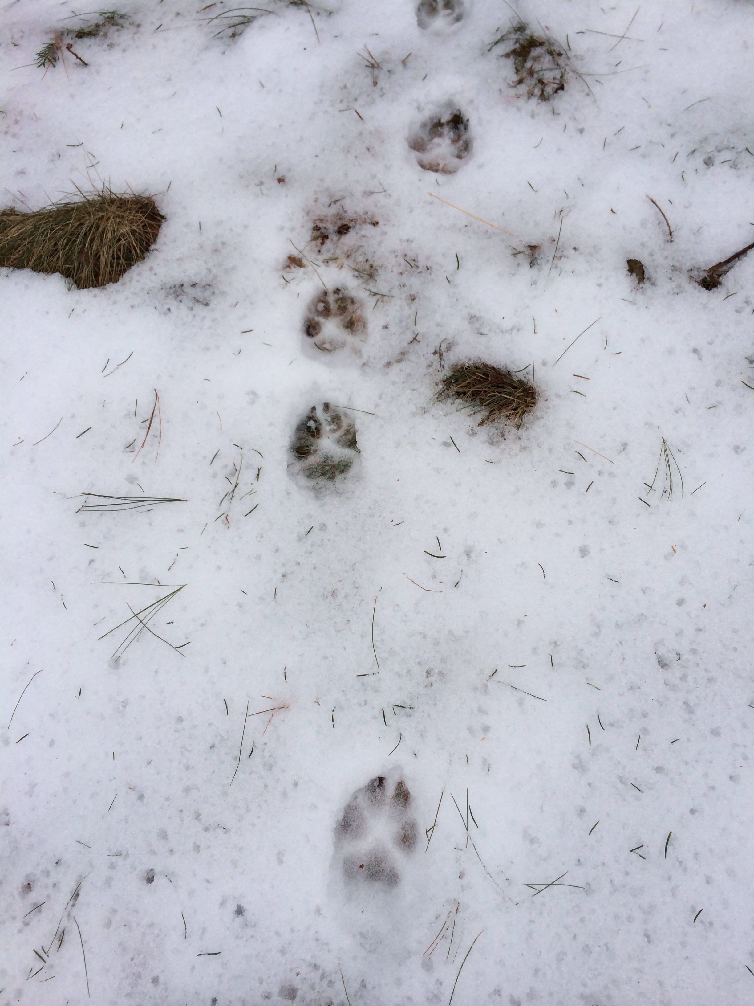 A little poem to my friend, the coyote, who left the tracks above.  I’ve seen him/her a couple of times in the past few months, but always, thankfully, on his (or her) lonesome.  Apparently, you can tell it’s a coyote track by the distinctive X, which is most visible in the bottom-most track.