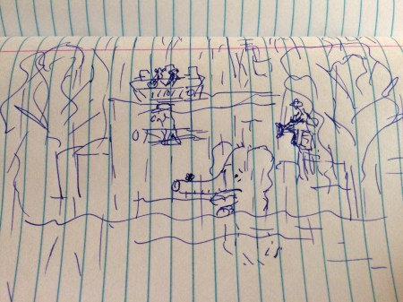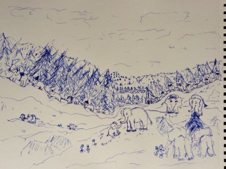 Final process note–I am in New York City right now–so apologies for my ignorance of Oklahoma–California too– though I took out that stanza! Also I am without either pencil, eraser or drawing pad– I really am not used to drawing without an eraser! Agh!