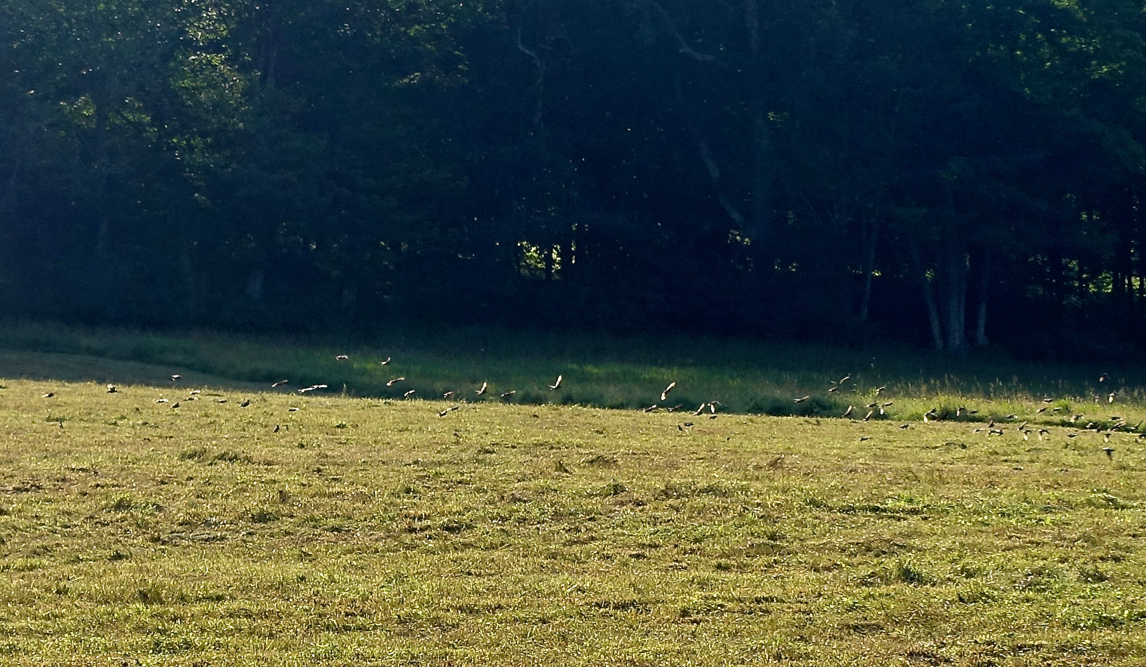 The July haying is a wonderful event. The bugs (and the worms??) are disturbed, the birds come to feast.