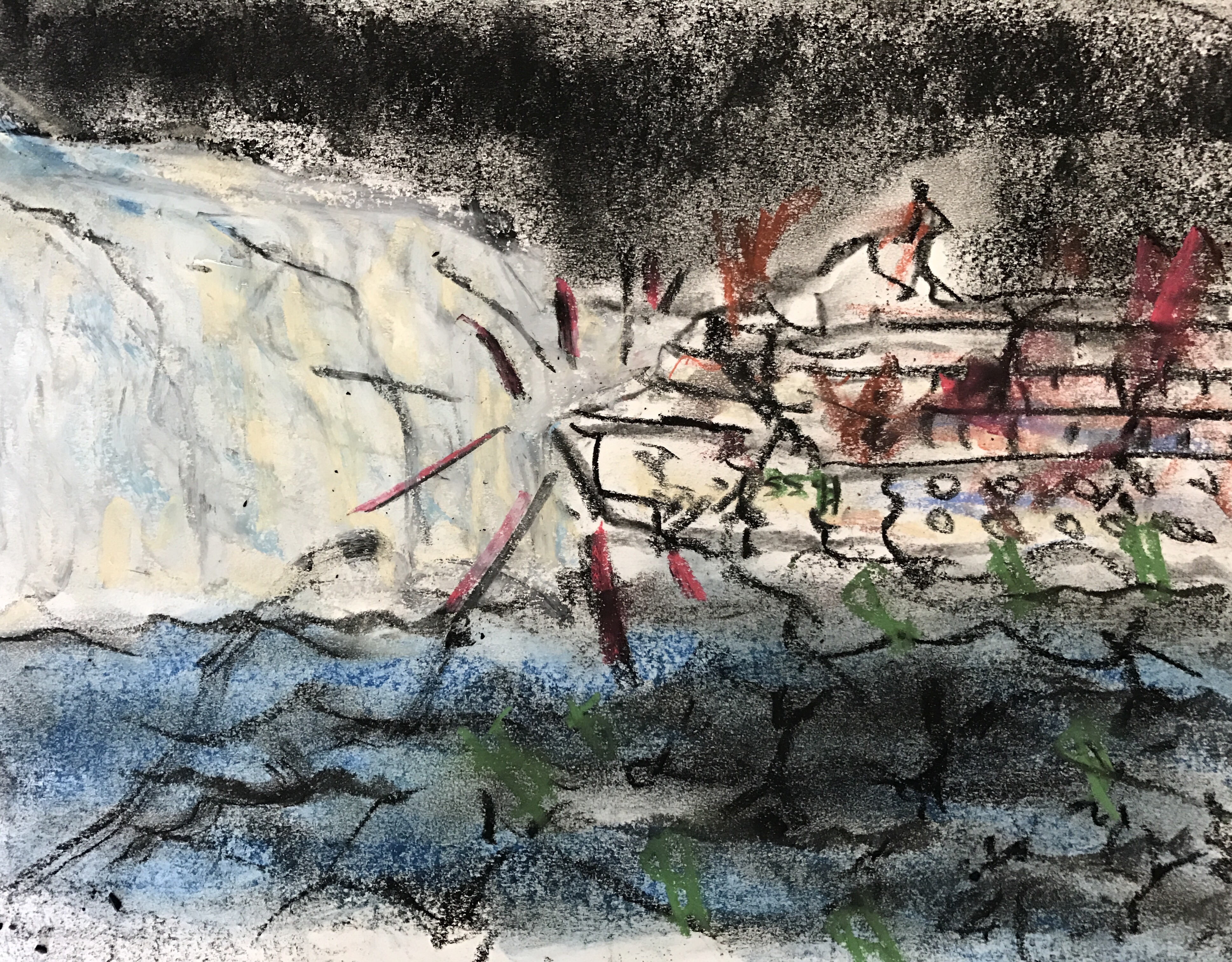 Diatribe of sorts for Brendan’s much more thoughtful prompt on Real Toads to write something stemming from planetary destruction. Picture is mine, charcoal, chalk and oil pastels on paper, 2017, all rights reserved.