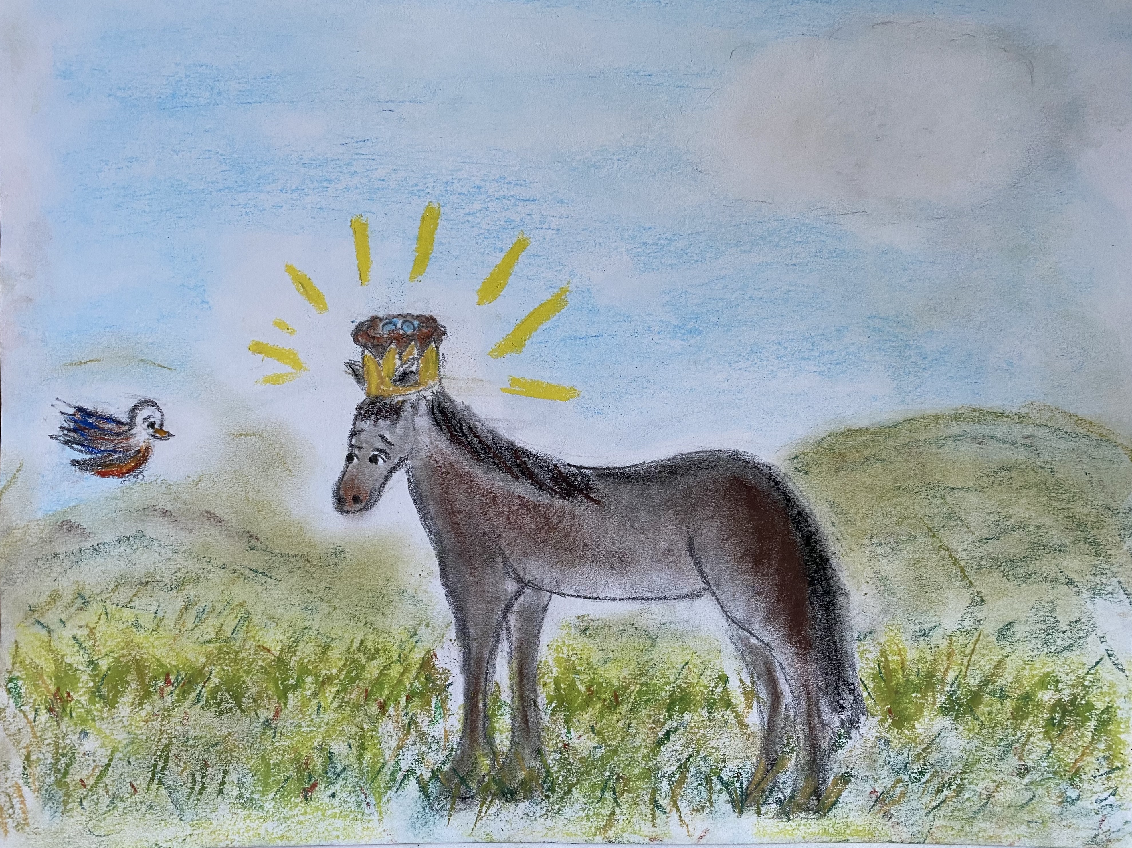 This horse will have to walk very gently, so as not to disturb crown or nest. I feel there’s a story that will go with this one, but I’m not yet sure of it.