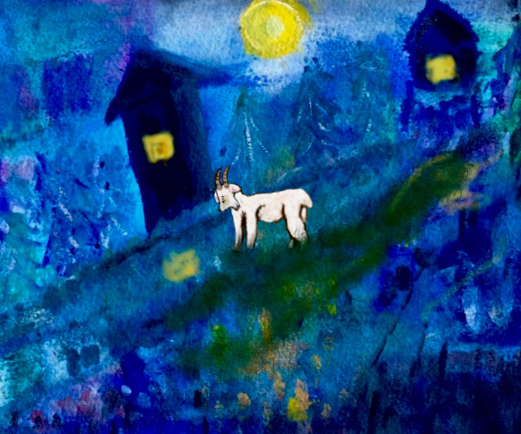 Goats are not magpies, but they also love a shine, and the little curve of gold felt like a personal moon. He tried to pick it up, but though his nose was aquiline (goats’ are), it did not skewer the ring as he’d expected, but simply knocked it to the floor.