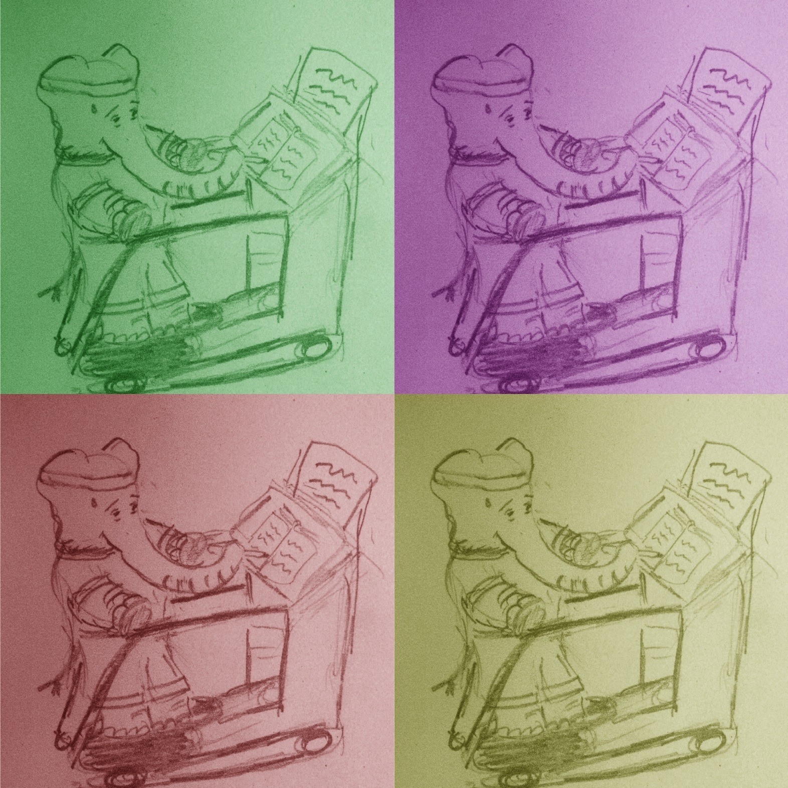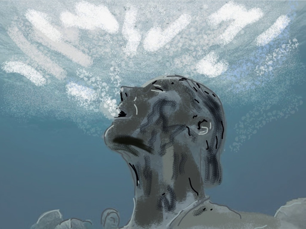 The above is my pictorial take on a photographic prompt of Tess Kincaid, of Magpie Tales, which, in turn, is a photograph of a sculpture by Jason deCaries Taylor. The picture looks a bit grim–my tale, below, is actually on the humorous side.