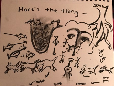 Roses with child’s painting.  Charcoal on paper, 2017, all rights reserved.