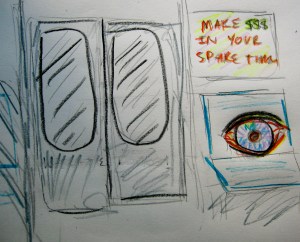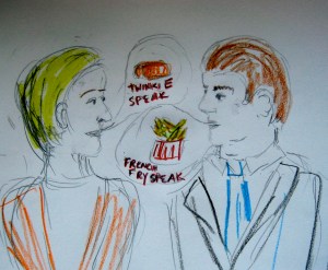 As I sat down on the new train,I wanted to tell everyone around me about the rat, but they were all tuning out (into iPods or studied disinterest), so I made myself hold in all the excitement. Only now through the end doors of the car, came a scrawny and somehow flattened middle=aged woman in a short leopard coat over jeans that showed her to be so knock-kneed that her shins looked like the prongs of a dowser’s fork.