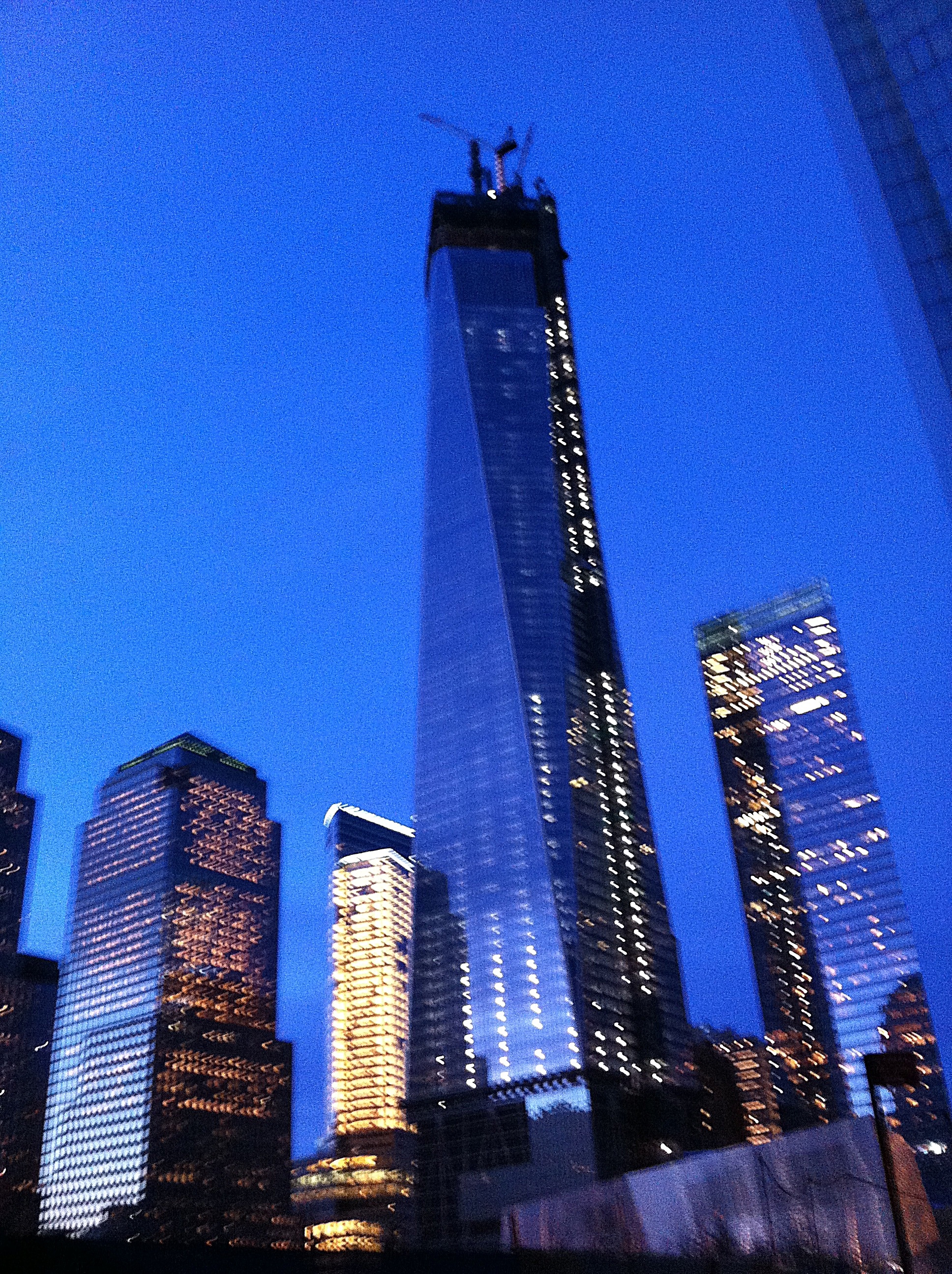 A few days ago, I posted a picture taken of One World Trade Center, the replacement for the old World Trade Towers, taken at night in fog and looking very foreshortened. I thought people might find it interesting to see the building from a different perspective which shows it to be really very tall. (This picture was taken last night.) It will be 104 stories when completed and the tallest building in the Western Hemisphere. For a sense of perspective – the building on the far left side — the World Financial Center–is over 40 stories.