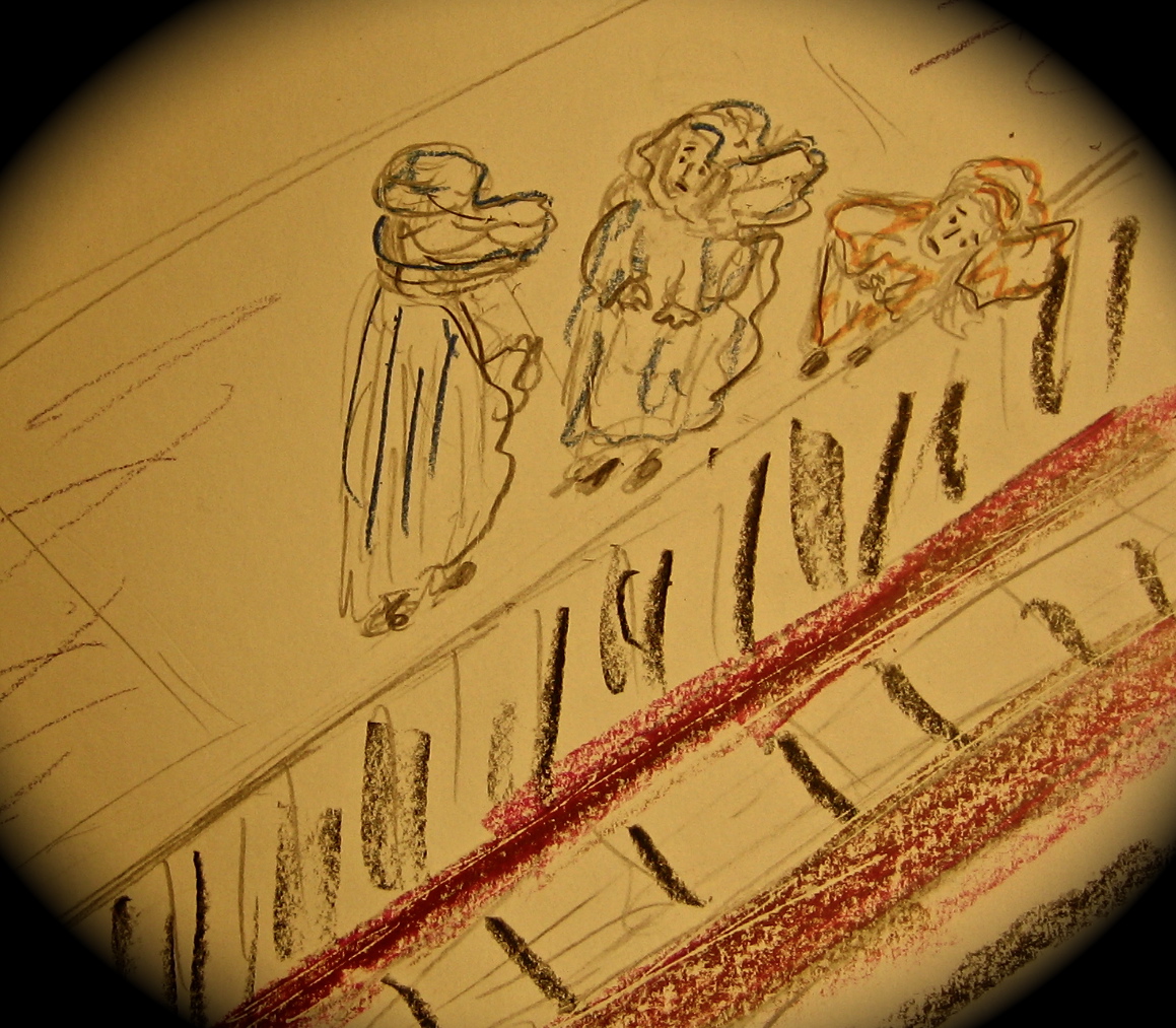 As I sat down on the new train,I wanted to tell everyone around me about the rat, but they were all tuning out (into iPods or studied disinterest), so I made myself hold in all the excitement. Only now through the end doors of the car, came a scrawny and somehow flattened middle=aged woman in a short leopard coat over jeans that showed her to be so knock-kneed that her shins looked like the prongs of a dowser’s fork.