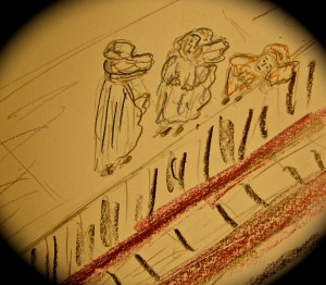 Thanks God, the Express (running now on the Local track) was also in the station. The couple, determined, scurried around the rat pillars and into it, with me glomming just behind. .